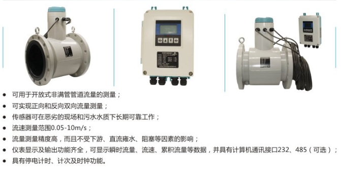 非滿管流量計顯示及輸出功能齊全,可顯示瞬時流量、流速、累積流量等數(shù)據(jù),并具有計算機(jī)通訊接口232、485(選配件);