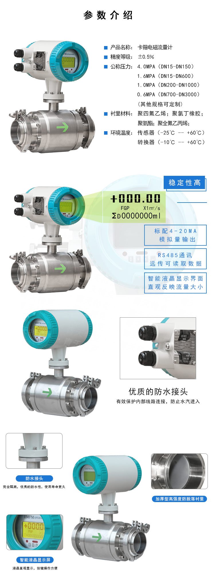 傳感器將感應電勢E作為流量信號,傳送到轉換器,經放大,變換濾波用一系列的數字處理后,用帶背光的點陣式液晶顯示瞬時流量和累積流量。轉換器有4~20mA輸出,報警輸出及頻率輸出,并設有RS-485等通訊接口,并支持HART和MODBUS協議。
